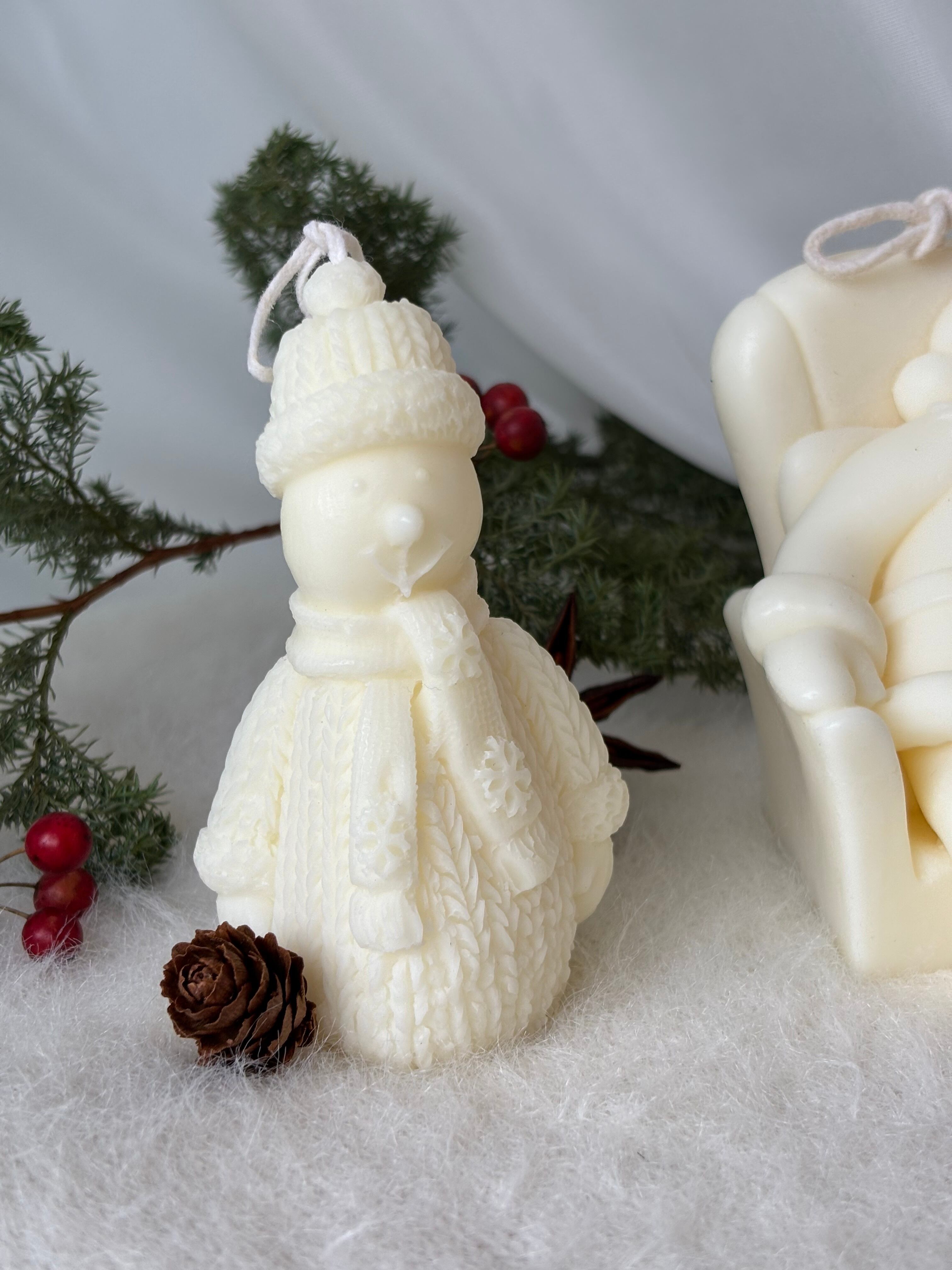 ふんわりニット帽と、あったかマフラーを身につけた雪だるまのキャンドル。